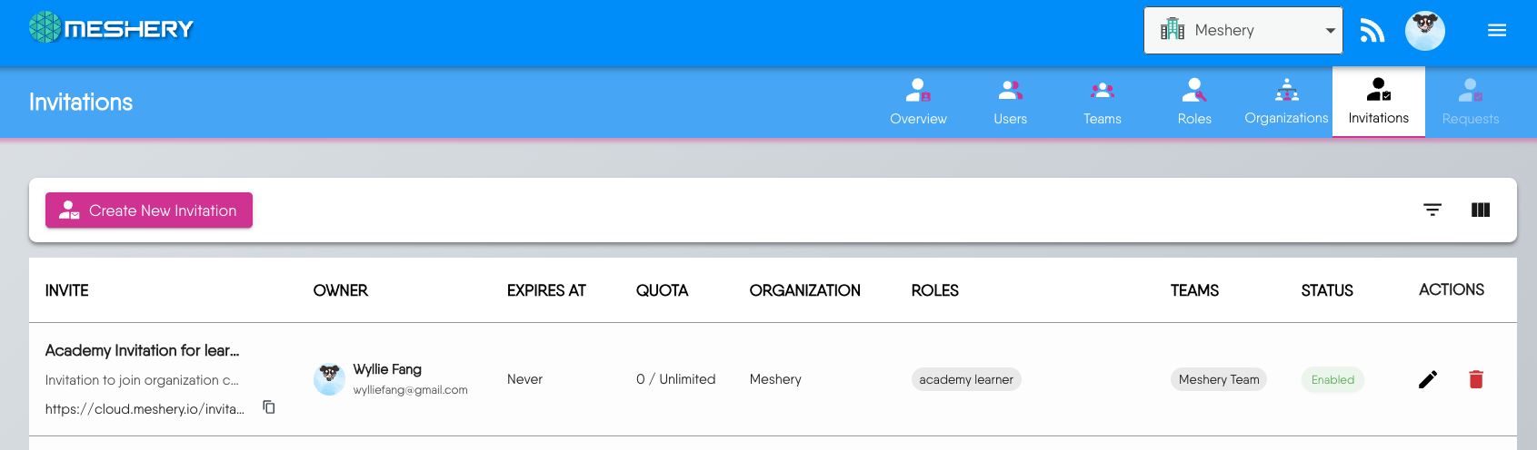 Navigate to Identity → Invitations to find your automatically created invitation.